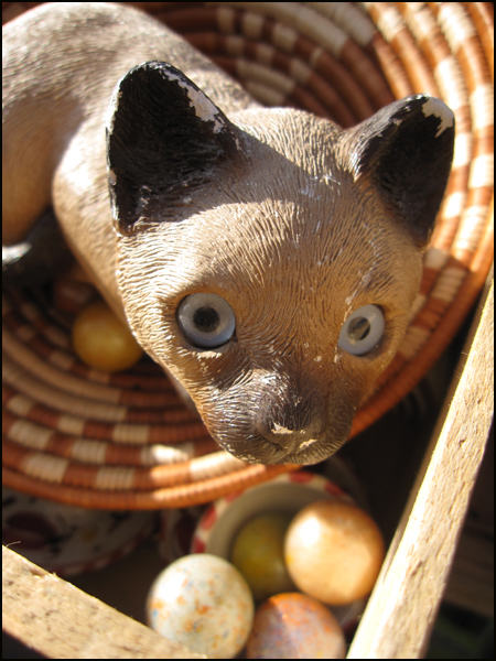 Hello, Kitty, goodbye heart! My recently acquired plaster cat was found in a large wooden crate at the Porte de Vanves Flea Market in Paris.