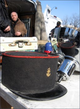 Once you’ve arrived, take a deep breath. Keep your head. Throughout the flea market, you’ll find scads and gads of vintage clothes, along with perfume bottles, belts, bags, hats, hat boxes, jewelry, sunglasses, and shoes. Also, watch out for haute couture labels.