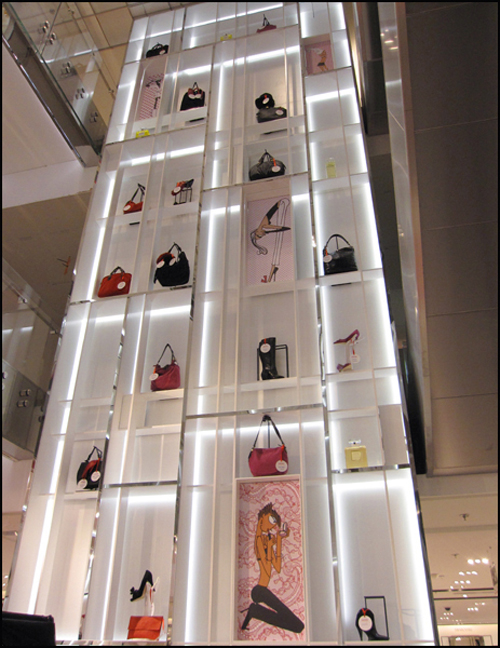 Inside you’ll also be dazzled by the recently installed super-cool (and eco-friendly) LED lighting system that illuminates and opens up the heart of the store: the central atrium. Resembling an over-sized Lucite jewelry box, this pleasing eye candy is decked out in slick marble, sleek bands of iced chrome, and live trees that sprout multi-colored handbags. Ma joie!