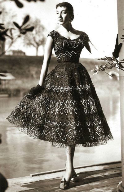 4/24/1955 Rome: On the Bank of Rome’s Tiber River, A model displays a black raffia laced dress, designed by the Fontana Sisters for warm afternoon near the sea or river. It has simple rounded decollete and a black taffeta underskirt.