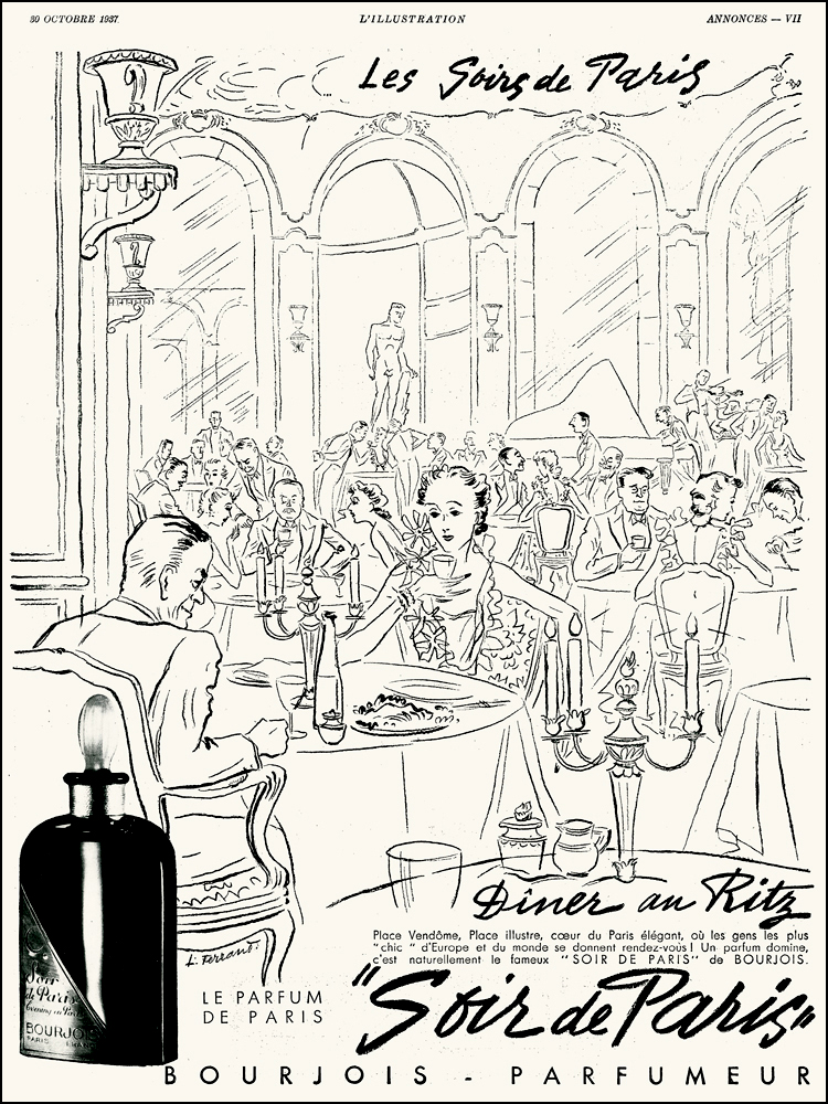 Illustrated by Louis Ferrand, Soir de Paris by Bourjois, Ritz Paris, L’Ilustration, 1937