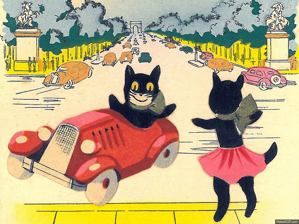 Kitty Cats on Avenue Foch with the Arc de Triomphe in view GIF by Theadora Brack (Postcard, 1950s, T. Brack’s archives)